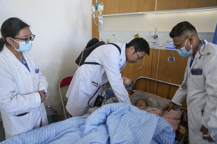 來自大連醫(yī)科大學附屬第一醫(yī)院的援藏醫(yī)生田聰亮(左二)和同事在西藏那曲市人民醫(yī)院查房(2025年7月18日攝)。新華社記者 晉美多吉 攝
