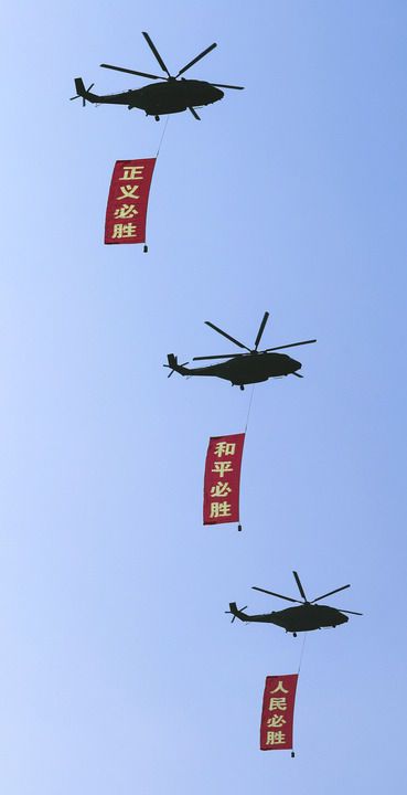 2025年9月3日,紀念中國人民抗日戰(zhàn)爭暨世界反法西斯戰(zhàn)爭勝利80周年大會在北京隆重舉行。這是空中護旗梯隊通過天安門廣場,3架直-8L運輸直升機分別懸掛“正義必勝”“和平必勝”“人民必勝”條幅。新華社記者 李鋼 攝