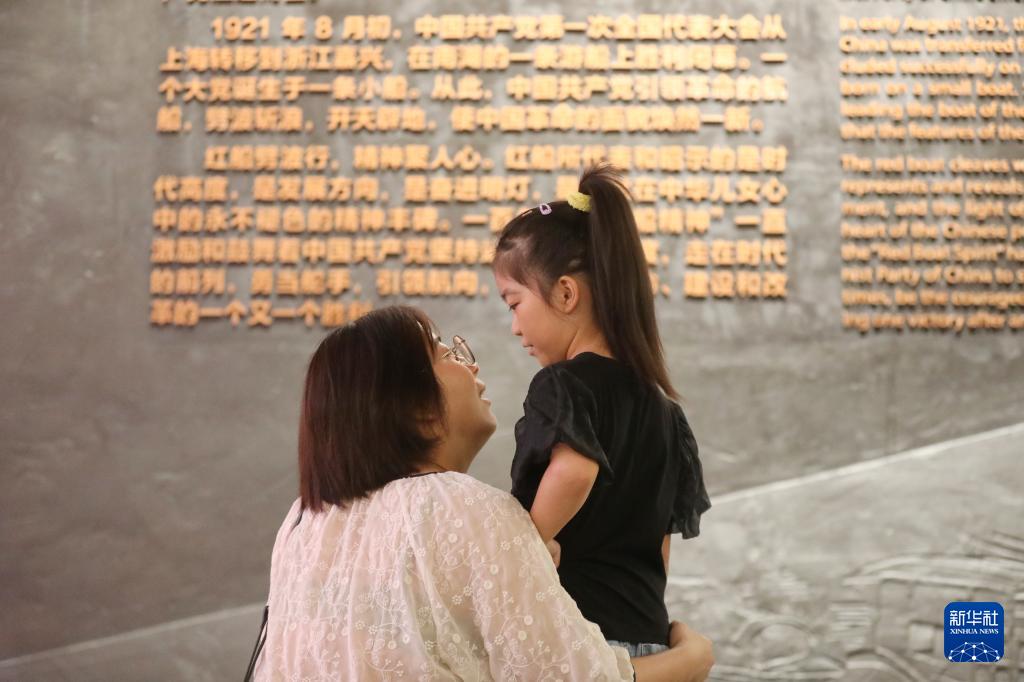 10月7日,在浙江省嘉興市南湖革命紀(jì)念館,家長為孩子講解革命歷史。