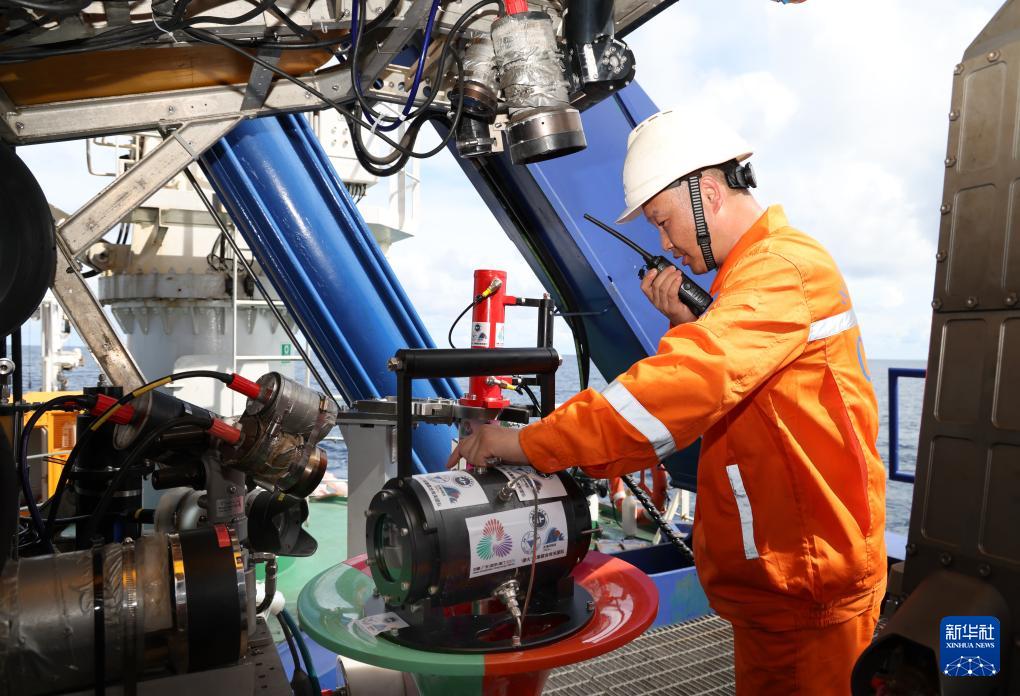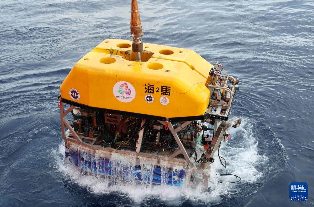“海洋地質(zhì)二號”科考船搭載“海馬”號深海遙控潛水器在南海北部進(jìn)行“源火”采集(9月18日攝)。