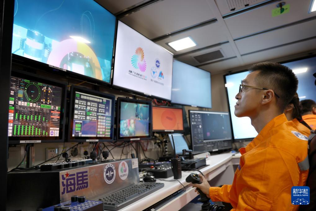 在科考船上的“海馬”號深海遙控潛水器控制室里,工作人員遙控采火裝置在海底進(jìn)行作業(yè)(9月18日攝)。