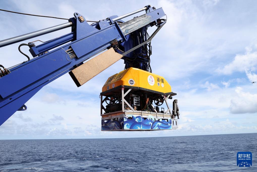 “海馬”號深海遙控潛水器搭載著采火裝置準(zhǔn)備下水采集“源火”(9月18日攝)。