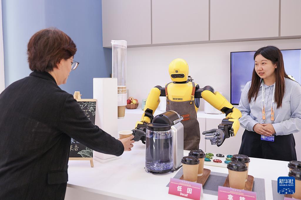 10月14日,參觀者在展覽上體驗(yàn)機(jī)器人制作咖啡。