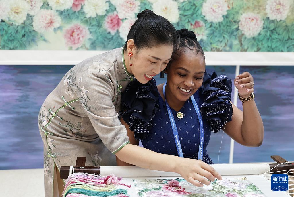 10月14日,來自博茨瓦納的嘉賓在展覽上體驗(yàn)中國刺繡。