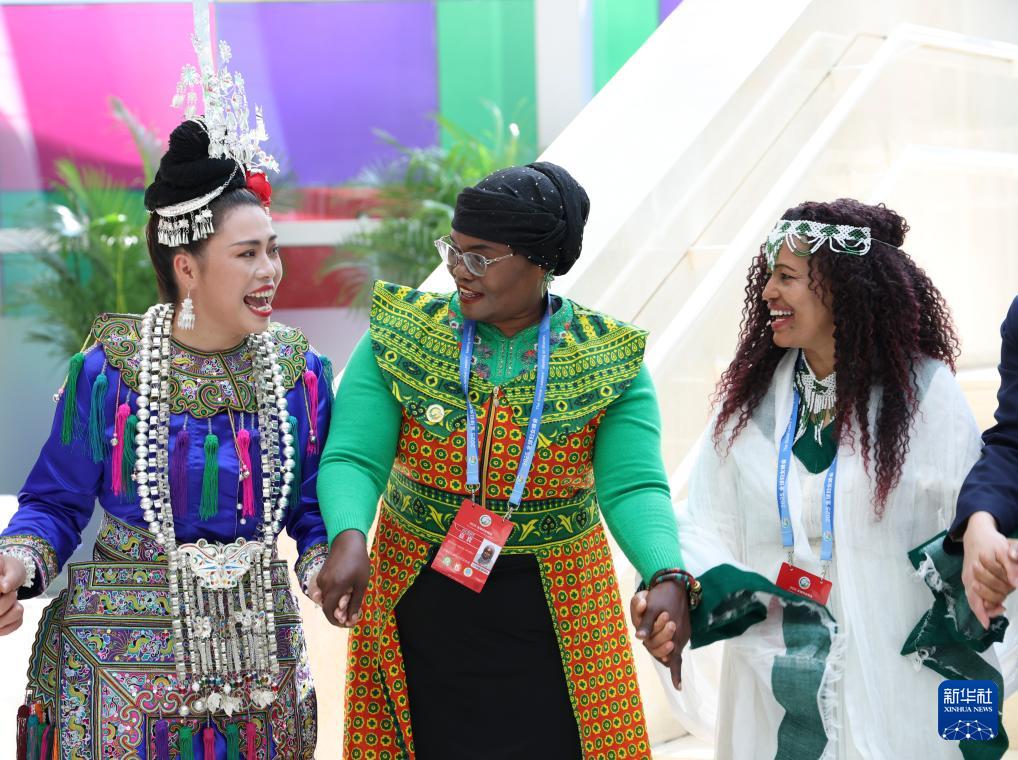 10月14日,來自坦桑尼亞和埃塞俄比亞的嘉賓在展覽現(xiàn)場(chǎng)上與侗族大歌表演者們一起載歌載舞。