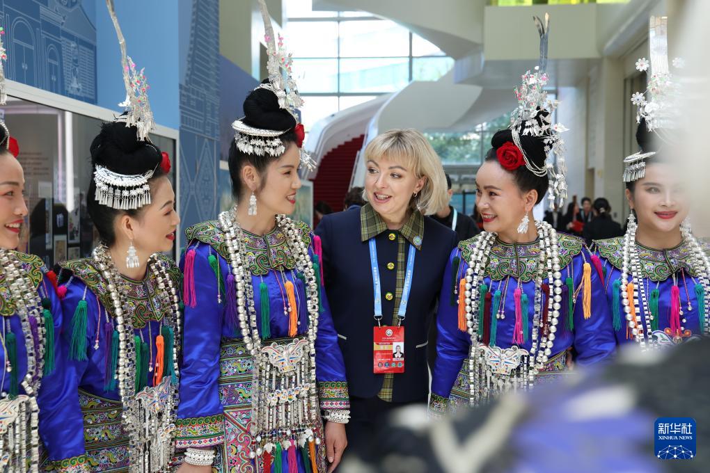 10月14日,來自白俄羅斯的嘉賓在展覽現(xiàn)場(chǎng)與侗族大歌表演者們交流。