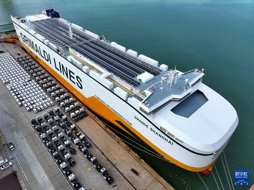 10月14日,在江蘇省連云港港東方港務(wù)分公司碼頭,滾裝輪裝載汽車準備外運(無人機照片)。