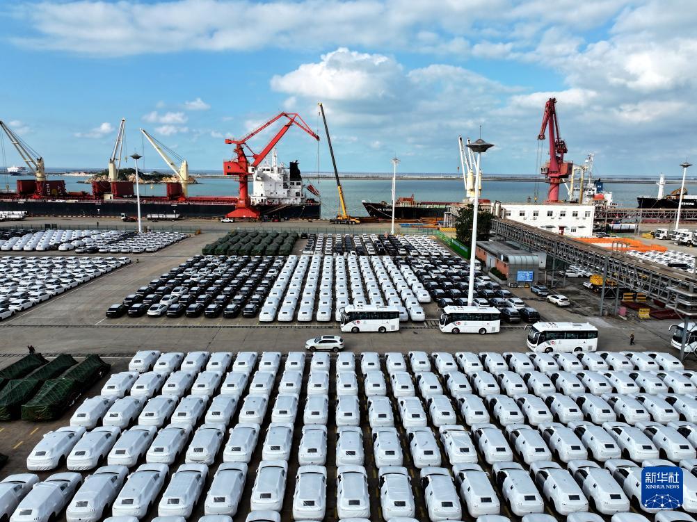 10月14日,在江蘇省連云港港東方港務(wù)分公司碼頭,大批汽車準備裝船外運(無人機照片)。