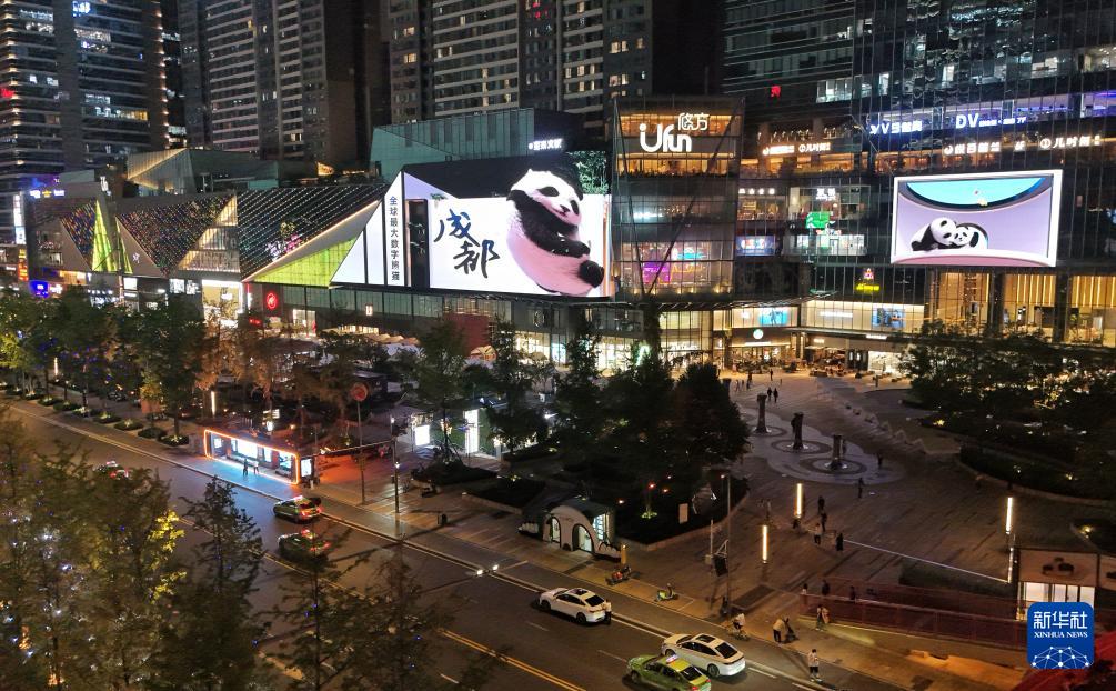 10月14日拍攝的裸眼3D數(shù)字熊貓與一旁交子雙塔的燈光秀(無(wú)人機(jī)照片)。