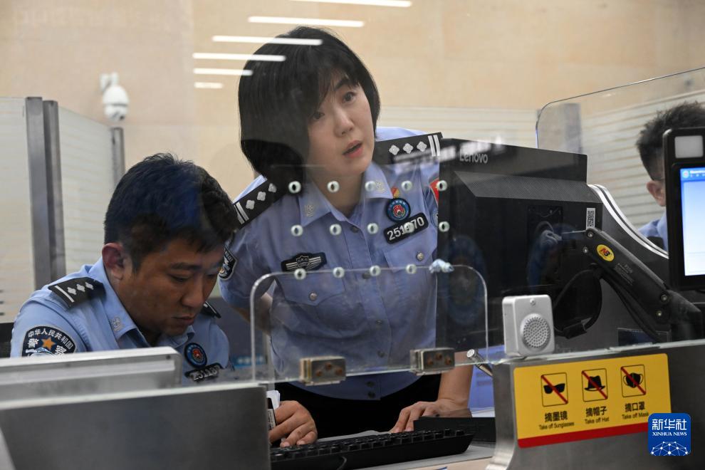 10月14日,移民管理警察曹銳(右)在驗證臺幫助一線民警核驗護(hù)照。