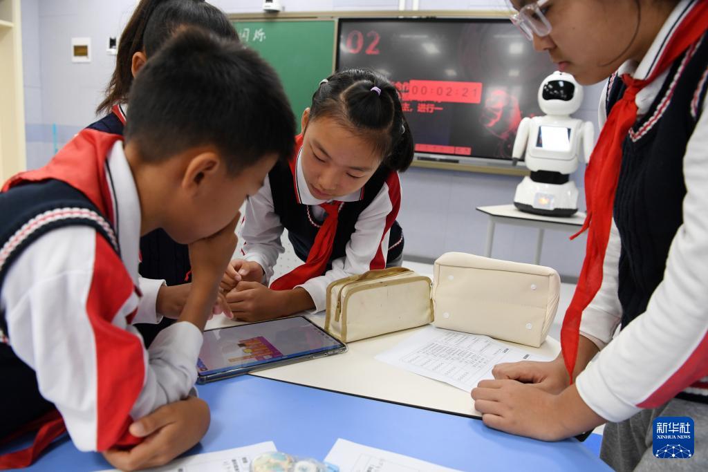 10月15日,在北京市海淀區(qū)第四實驗小學(xué)《閃爍信號》主題人工智能公開課上,學(xué)生通過自己編寫的程序向機器人發(fā)指令。