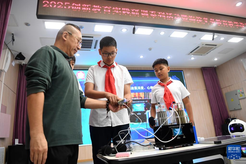 10月15日,在北京市海淀區(qū)第四實驗小學(xué),人工智能社團的學(xué)生用其制作的“極客氫氧太陽能保健機”為現(xiàn)場嘉賓進行健康監(jiān)測。