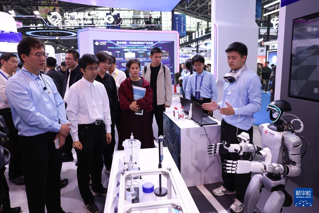 10月17日,參觀者在博覽會(huì)上觀看機(jī)器人操控技術(shù)展示。