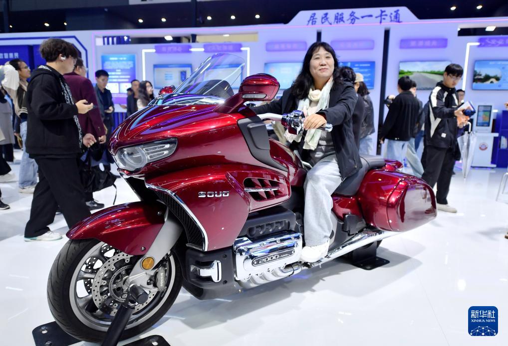 10月17日,觀眾在博覽會(huì)上體驗(yàn)國產(chǎn)摩托車。