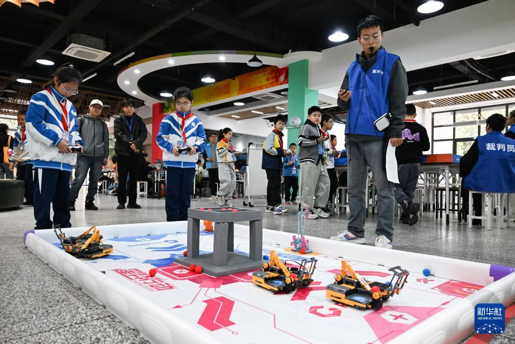 10月18日,學(xué)生在西安市新城區(qū)太華路小學(xué)參加機(jī)器人挑戰(zhàn)賽。