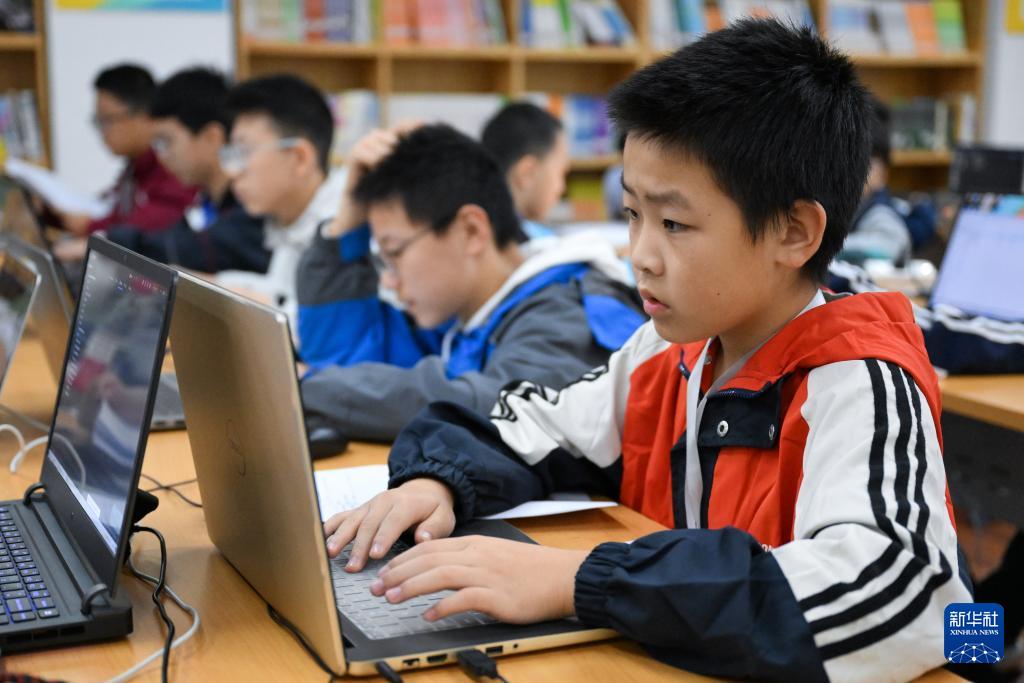 10月18日,學(xué)生在西安市新城區(qū)太華路小學(xué)參加人工智能創(chuàng)意編程挑戰(zhàn)賽。