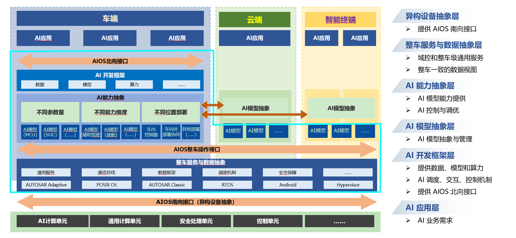 針對(duì)于AIOS整體框架,李冰針對(duì)異構(gòu)設(shè)備抽象層、整車(chē)服務(wù)與數(shù)據(jù)抽象層、AI能力抽象層、AI模型抽象層、AI開(kāi)發(fā)框架層、AI應(yīng)用層的六層架構(gòu)做了簡(jiǎn)略介紹。