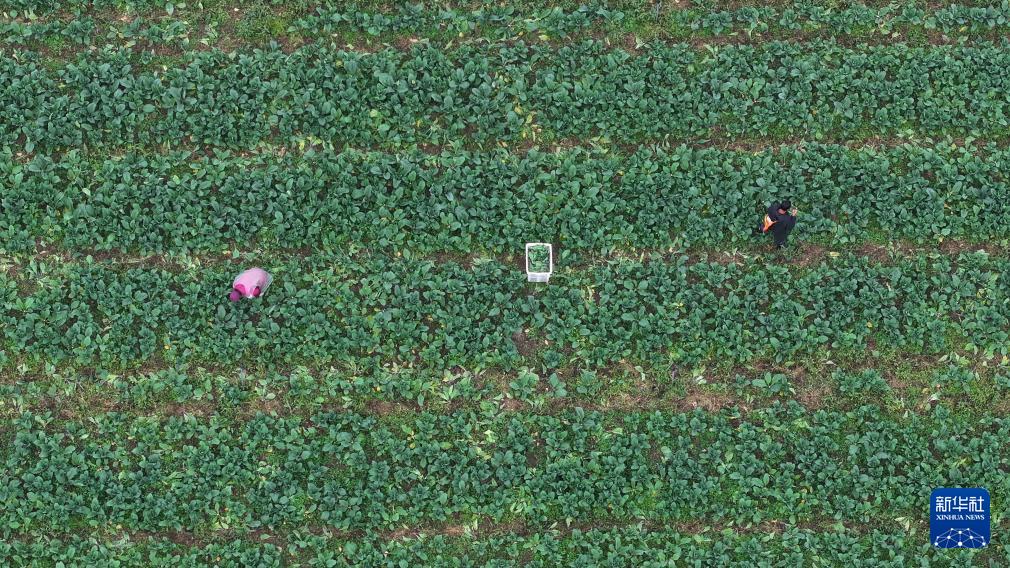 10月30日,菜農(nóng)在沅江市草尾鎮(zhèn)樂(lè)園村蔬菜田里采收蔬菜(無(wú)人機(jī)照片)。