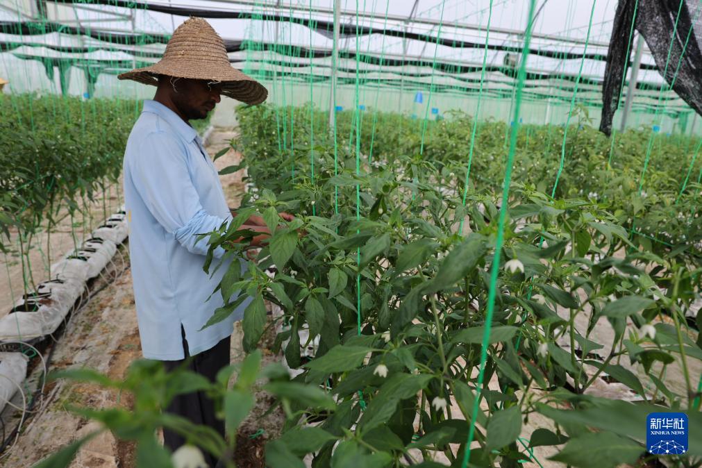11月3日,在文萊斯里巴加灣市郊一處農(nóng)業(yè)科技產(chǎn)業(yè)園,工作人員查看辣椒的生長情況。