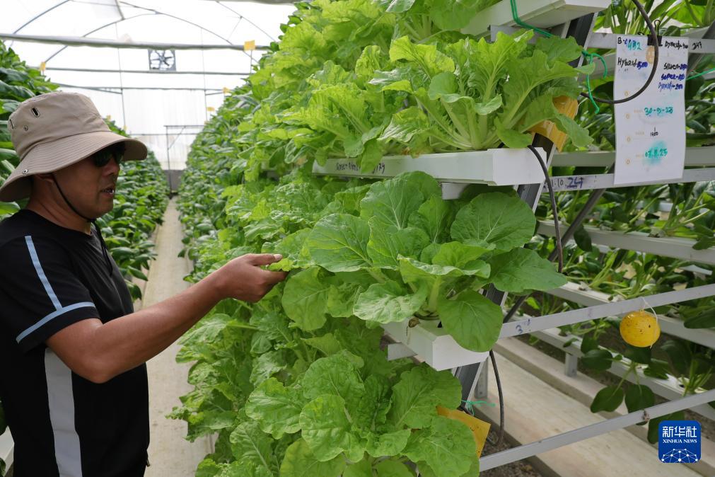 11月3日,在文萊斯里巴加灣市郊一處農(nóng)業(yè)科技產(chǎn)業(yè)園,來自中國寧夏回族自治區(qū)固原市的農(nóng)業(yè)技術(shù)專家李繼華查看用水培技術(shù)種植的蔬菜的生長情況。