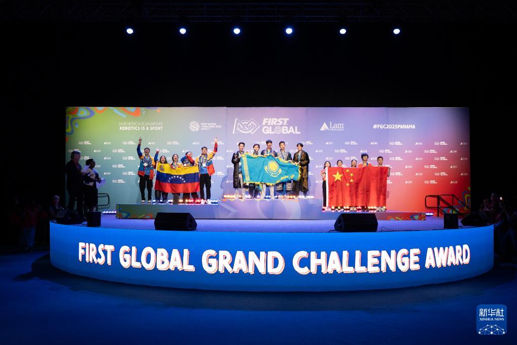 11月1日,在巴拿馬首都巴拿馬城,中國隊隊員在2025年FIRST全球機器人挑戰(zhàn)賽領獎臺上領獎。