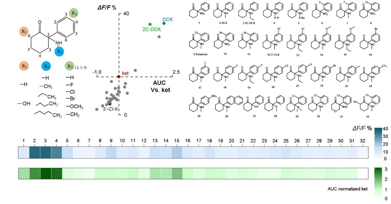 基于對(duì)上述機(jī)制的深入理解,研究者以“增強(qiáng)腺苷釋放”為表型指標(biāo),設(shè)計(jì)并篩選了一系列氯胺酮衍生物。其中,去氯氯胺酮在低劑量下即能誘發(fā)更強(qiáng)、更持久的腺苷信號(hào),并在行為學(xué)測(cè)試中表現(xiàn)出優(yōu)于氯胺酮的抗抑郁功效,同時(shí)其引發(fā)的運(yùn)動(dòng)亢進(jìn)副作用顯著減弱。值得注意的是,化合物的腺苷釋放效能與其對(duì)NMDA受體的抑制強(qiáng)度并無顯著相關(guān)性,提示其抗抑郁作用存在獨(dú)立于NMDAR抑制的新機(jī)制。