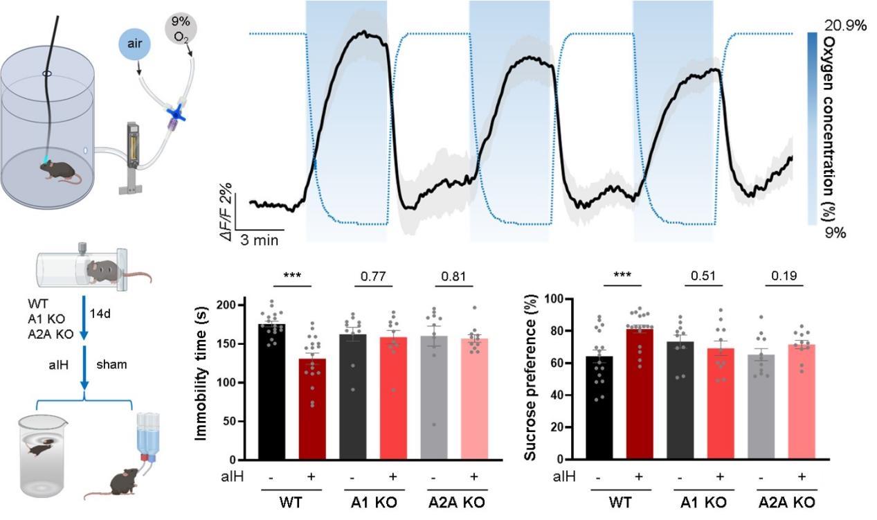 此外,研究者探索了非藥物手段提升腦內(nèi)腺苷的治療潛力。研究發(fā)現(xiàn),一種可控的急性間歇性低氧干預(yù)方案,能夠安全地誘發(fā)內(nèi)側(cè)前額葉皮層內(nèi)的腺苷釋放,并在抑郁模型小鼠中產(chǎn)生依賴于A1和A2A受體的快速抗抑郁效應(yīng)。