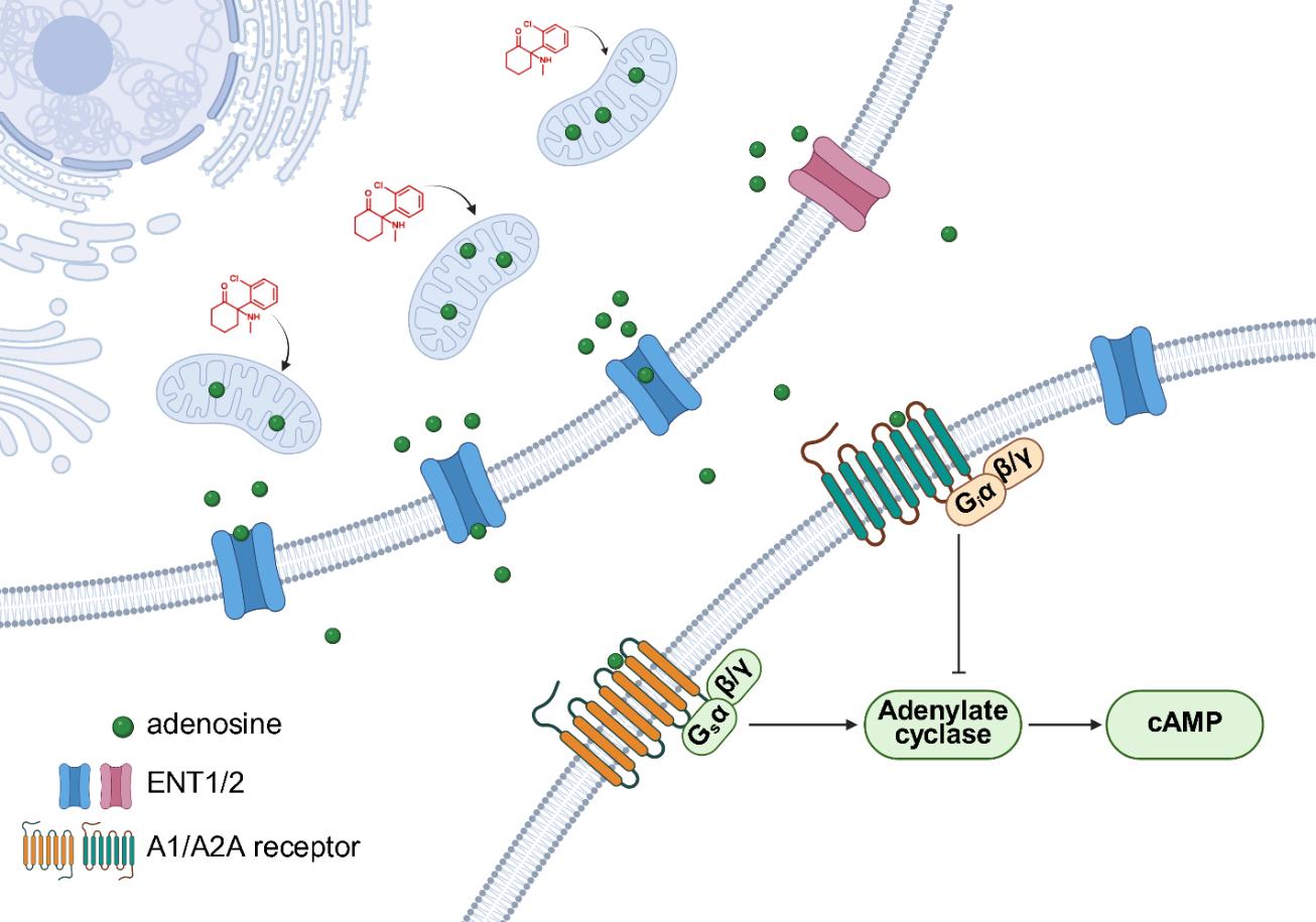 在機(jī)制上,研究深入探索了氯胺酮提升細(xì)胞外腺苷水平的來源。研究發(fā)現(xiàn),氯胺酮并未引起細(xì)胞外ATP/ADP水平的升高,且其效應(yīng)在CD73敲除小鼠中依然存在,排除了細(xì)胞外核苷酸水解是其主要來源的可能性。進(jìn)一步實(shí)驗(yàn)表明,抑制平衡型核苷轉(zhuǎn)運(yùn)體ENT1/2可顯著減弱氯胺酮誘導(dǎo)的腺苷釋放,提示其來源為細(xì)胞內(nèi)。利用ATP/ADP比率傳感器PercevalHR,研究者觀察到氯胺酮能夠迅速降低內(nèi)側(cè)前額葉皮層中興奮性神經(jīng)元、抑制性神經(jīng)元及星形膠質(zhì)細(xì)胞內(nèi)的ATP/ADP比率,且這一代謝變化在時(shí)間上早于細(xì)胞外腺苷的升高。體外線粒體代謝流分析顯示,氯胺酮在治療相關(guān)濃度下可直接抑制線粒體三羧酸循環(huán)的代謝通量。這些證據(jù)共同勾勒出一條新通路:氯胺酮通過直接調(diào)節(jié)細(xì)胞能量代謝,增加細(xì)胞內(nèi)腺苷,進(jìn)而通過核苷轉(zhuǎn)運(yùn)體釋放至細(xì)胞外。