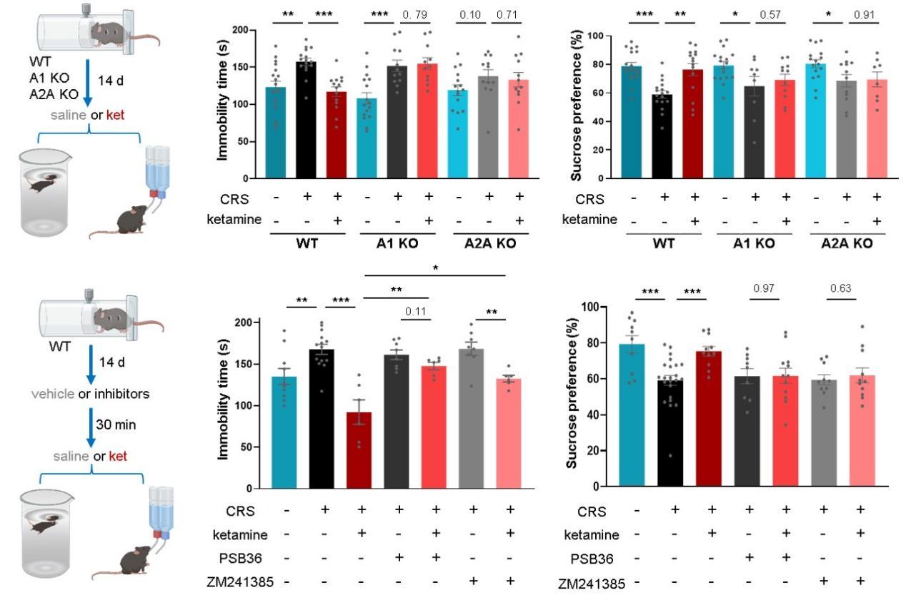 接下來,研究者通過遺傳學(xué)與藥理學(xué)手段,確證了腺苷信號(hào)對(duì)于抗抑郁效應(yīng)的必要性。在腺苷A1受體或A2A受體基因敲除的小鼠中,氯胺酮與電休克治療在強(qiáng)迫游泳實(shí)驗(yàn)和糖水偏好實(shí)驗(yàn)中所表現(xiàn)出的抗抑郁效應(yīng)完全消失。在野生型小鼠中,系統(tǒng)性給予A1或A2A受體拮抗劑,同樣能夠阻斷氯胺酮的抗抑郁作用。重要的是,受體敲除并不影響氯胺酮誘導(dǎo)的腺苷釋放本身,也不影響其引起的運(yùn)動(dòng)亢進(jìn)效應(yīng),表明腺苷信號(hào)通路特異性地介導(dǎo)了其治療作用,而非非特異性的行為效應(yīng)。
