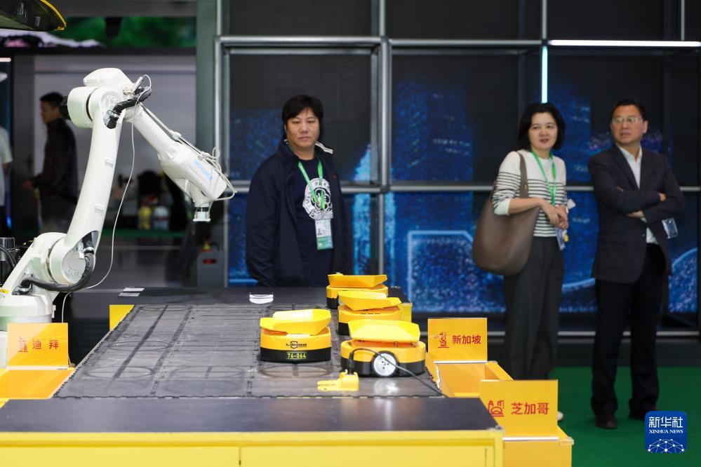 11月9日,參展人員在第八屆進(jìn)博會(huì)服務(wù)貿(mào)易展區(qū)DHL(敦豪)展臺(tái)查看智能物流系統(tǒng)。