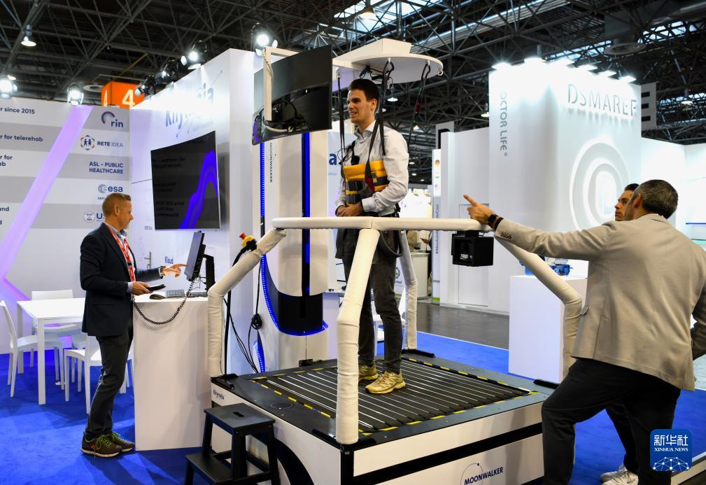 11月17日,一名參觀者在德國杜塞爾多夫國際醫(yī)療器械設(shè)備展上體驗(yàn)康復(fù)設(shè)備。