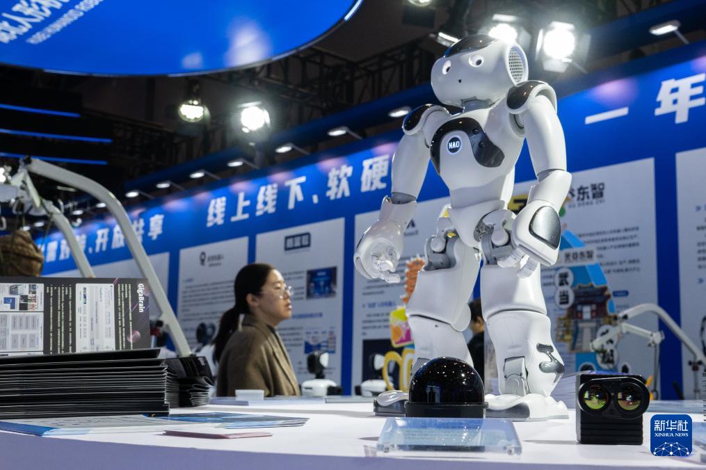 11月21日,參觀者在2025中國5G+工業(yè)互聯(lián)網(wǎng)大會(huì)展廳觀看展出的全尺寸長飛一號(hào)機(jī)器人,該機(jī)器人具有感知、運(yùn)控等功能。