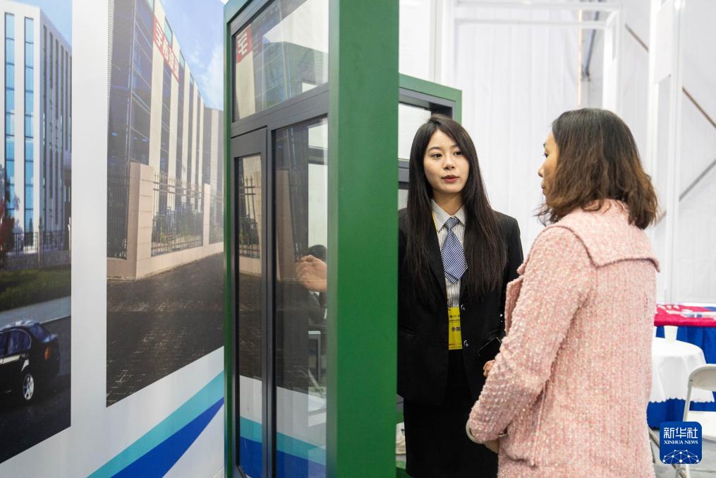 11月27日,在婁底經(jīng)開區(qū)電力科技谷,參展商(左)在介紹復(fù)合材料門窗。