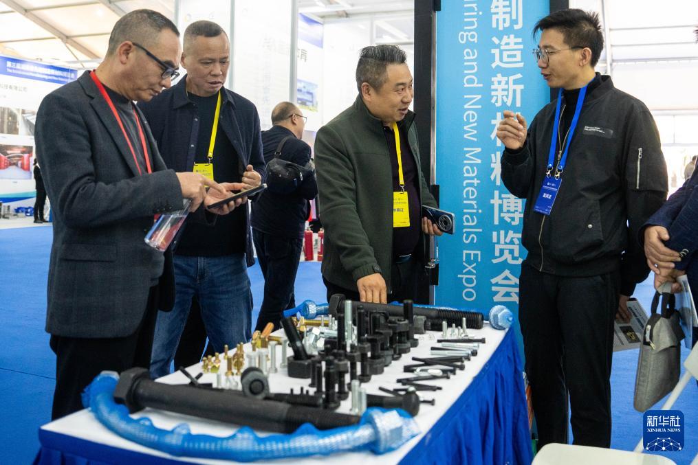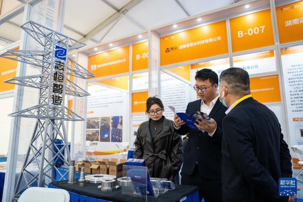 11月27日,在婁底經(jīng)開區(qū)電力科技谷,參觀者(右一)在了解高強度緊固件產(chǎn)品。