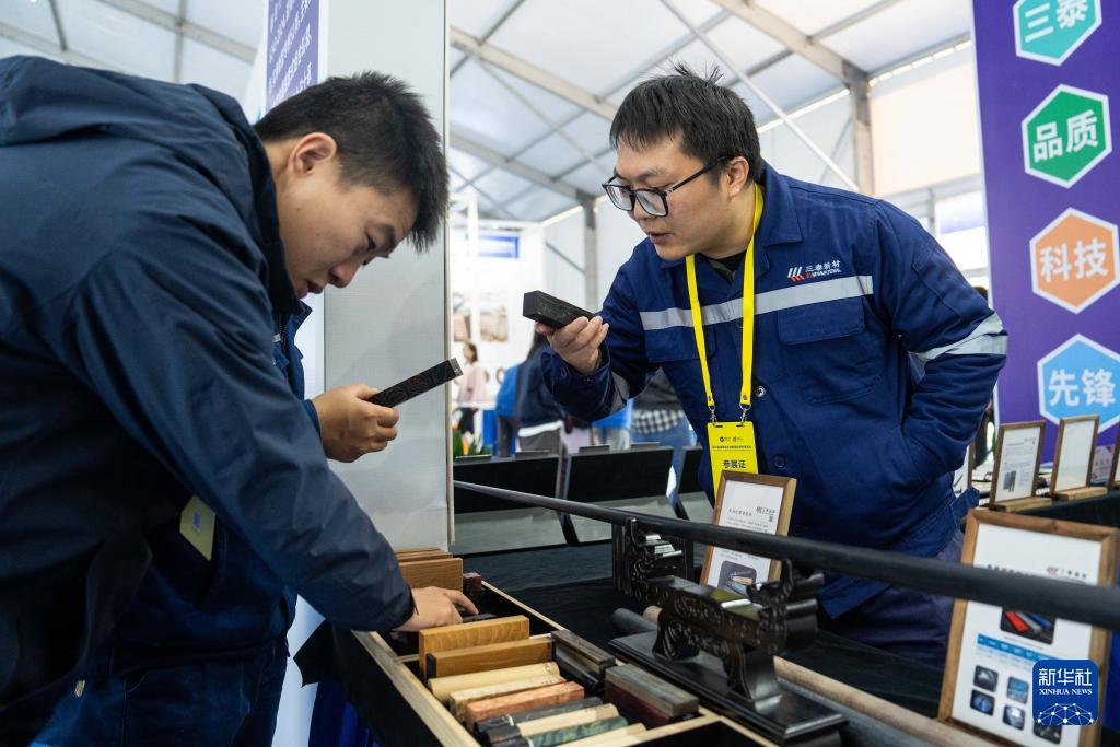 11月27日,在婁底經(jīng)開區(qū)電力科技谷,參展商(右)在介紹木基復(fù)合材料。