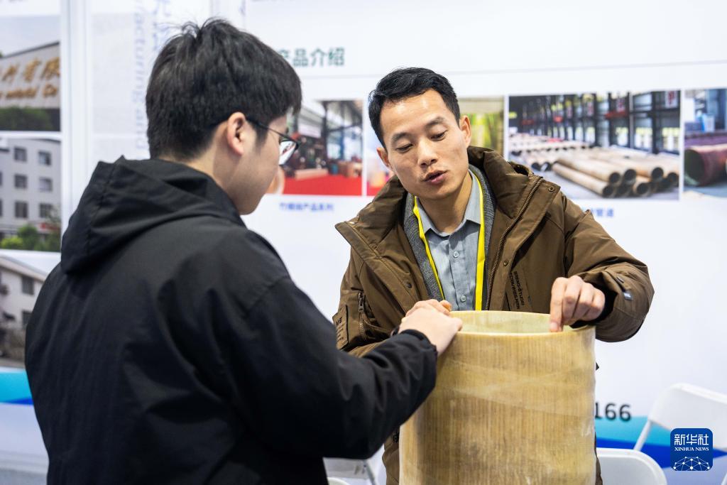 11月27日,在婁底經(jīng)開區(qū)電力科技谷,參展商(右)在介紹竹纏繞復(fù)合材料。