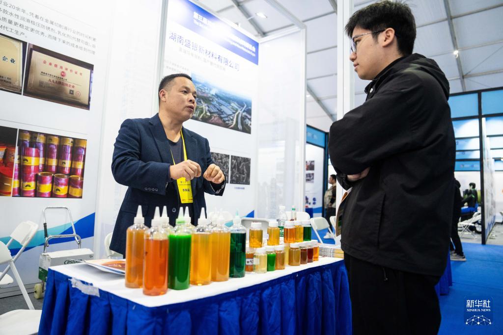 11月27日,在婁底經(jīng)開區(qū)電力科技谷,參展商(左)在介紹金屬切削液。