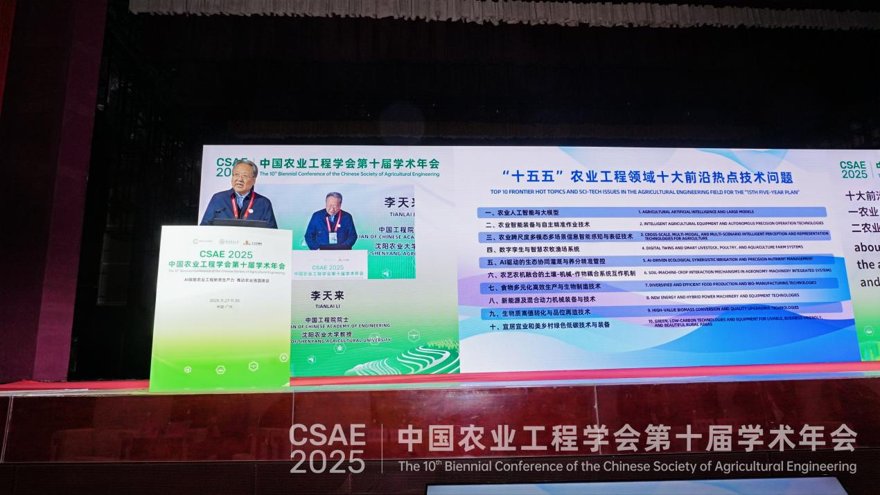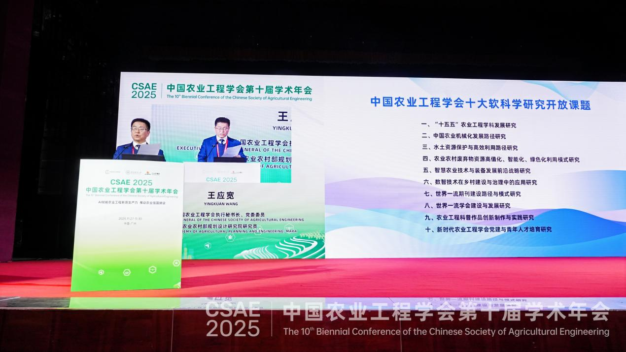開幕式上,中國農(nóng)業(yè)工程學(xué)會(huì)名譽(yù)理事長、中國工程院院士、沈陽農(nóng)業(yè)大學(xué)教授李天來發(fā)布了“面向‘十五五’農(nóng)業(yè)工程領(lǐng)域十大前沿科技熱點(diǎn)問題”,中國農(nóng)業(yè)工程學(xué)會(huì)執(zhí)行秘書長王應(yīng)寬研究員發(fā)布了學(xué)會(huì)“十大軟科學(xué)自主研發(fā)課題”。隨后,還舉行了中國農(nóng)業(yè)工程學(xué)會(huì)科普志愿服務(wù)分隊(duì)授旗儀式。