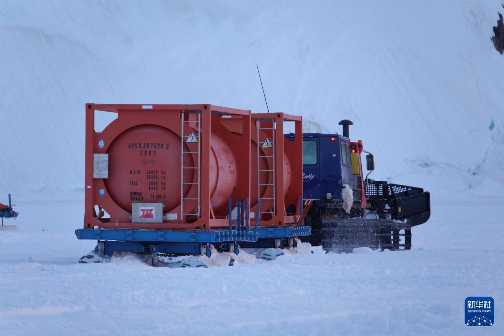 北京時間12月3日凌晨,雪地車?yán)訚M燃油的油罐離開“雪龍2”號,駛向中山站。
