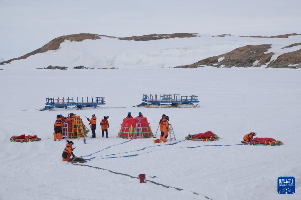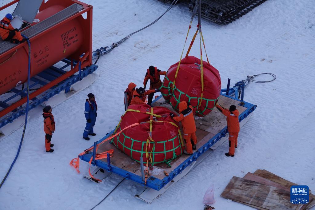 北京時間12月2日傍晚,工作人員在冰面上進(jìn)行油囊加注作業(yè)。