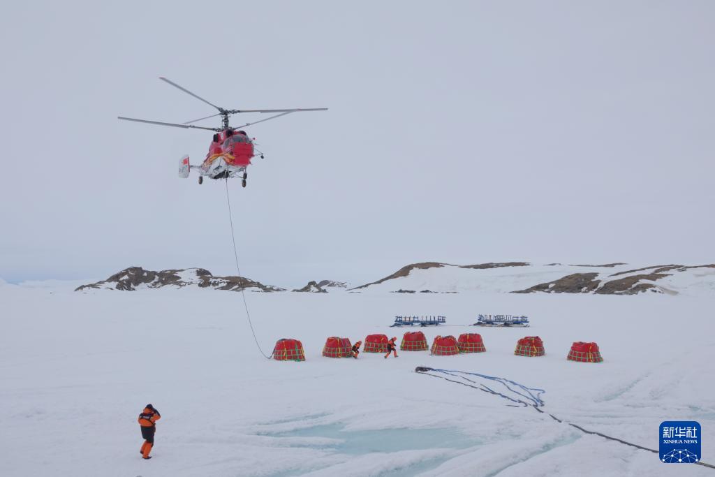 北京時間12月2日傍晚,“雪鷹102”直升機從“雪龍”號甲板飛至“雪龍2”號船側(cè)冰面作業(yè)點,開啟油囊吊掛作業(yè)。