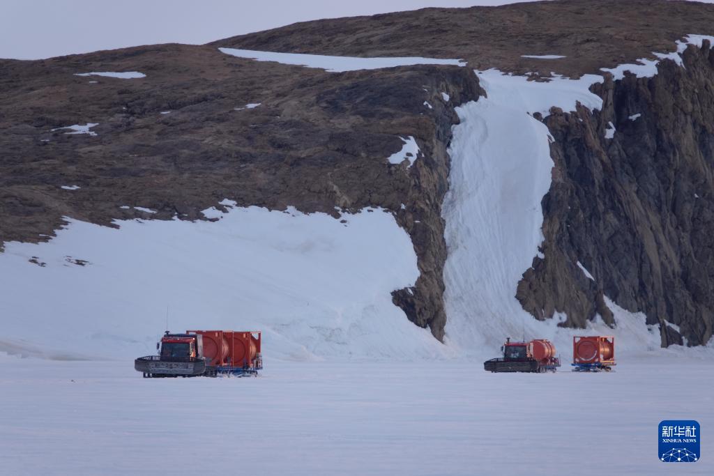 北京時間12月3日凌晨,從中山站和內(nèi)陸出發(fā)基地駛來的雪地車?yán)沼凸薜纸把?”號。