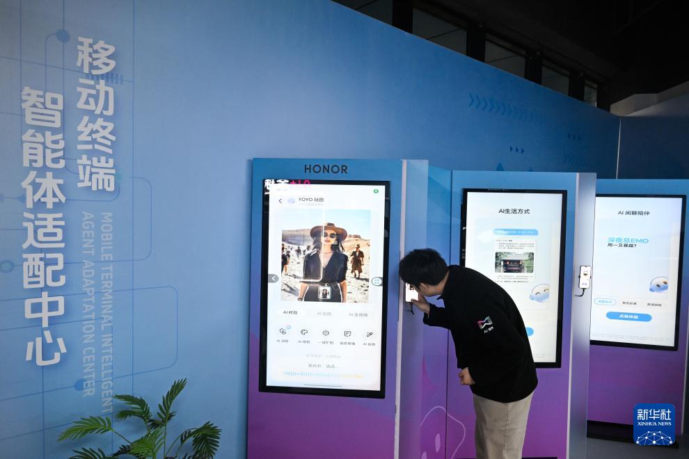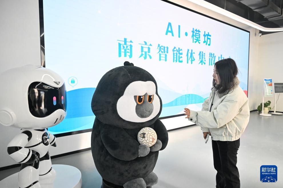 12月4日,在南京人工智能生態(tài)街區(qū)的“AI·模坊”南京智能體集散中心,工作人員與智能移動(dòng)終端互動(dòng)。