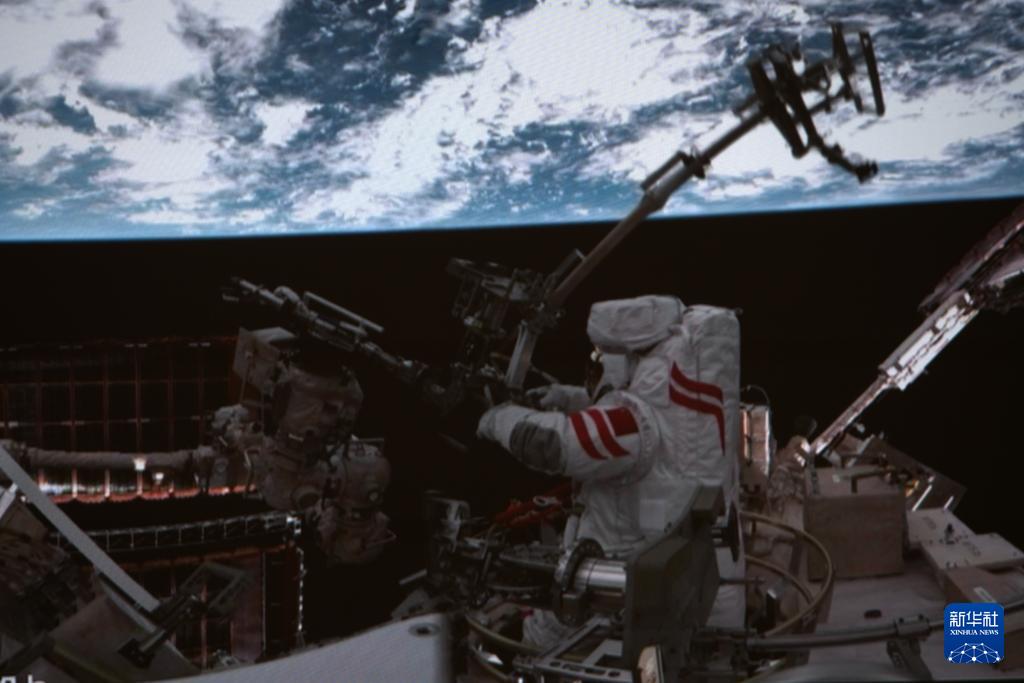 這是12月9日在北京航天飛行控制中心屏幕上拍攝的神舟二十一號乘組航天員張陸在艙外工作的畫面。