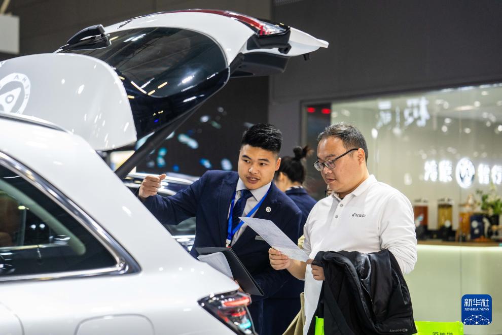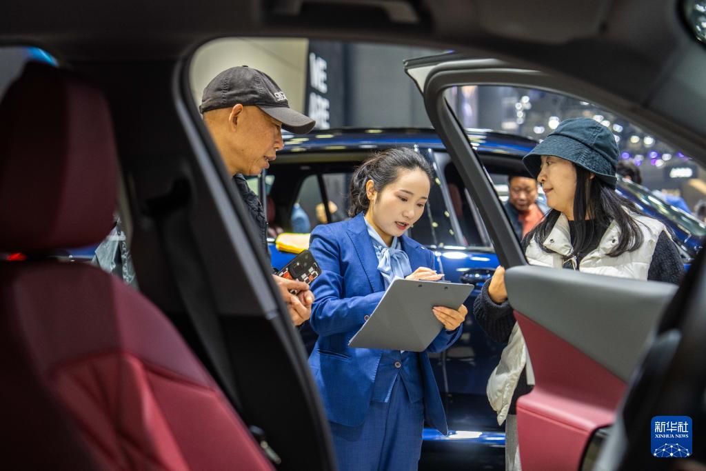 12月10日,在長沙國際會(huì)展中心,工作人員(左)在介紹參展車輛。