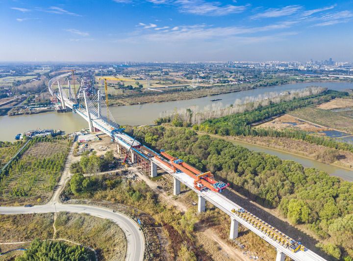 2025年11月20日,中鐵建大橋局施工機(jī)械在滬渝蓉高鐵江都段最后一榀箱梁架設(shè)現(xiàn)場(chǎng)作業(yè)(無(wú)人機(jī)照片)。新華社發(fā)(任飛攝)