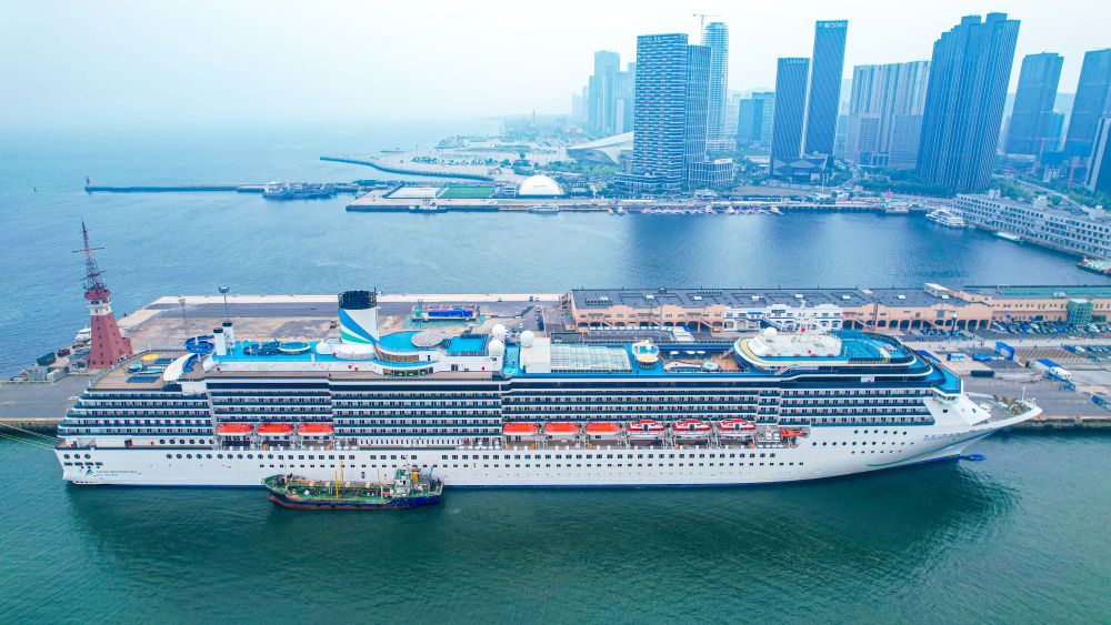 2025年5月27日拍攝的??吭诖筮B港國(guó)際郵輪中心泊位的“愛(ài)達(dá)·地中?!碧?hào)(無(wú)人機(jī)照片)。新華社記者 潘昱龍 攝