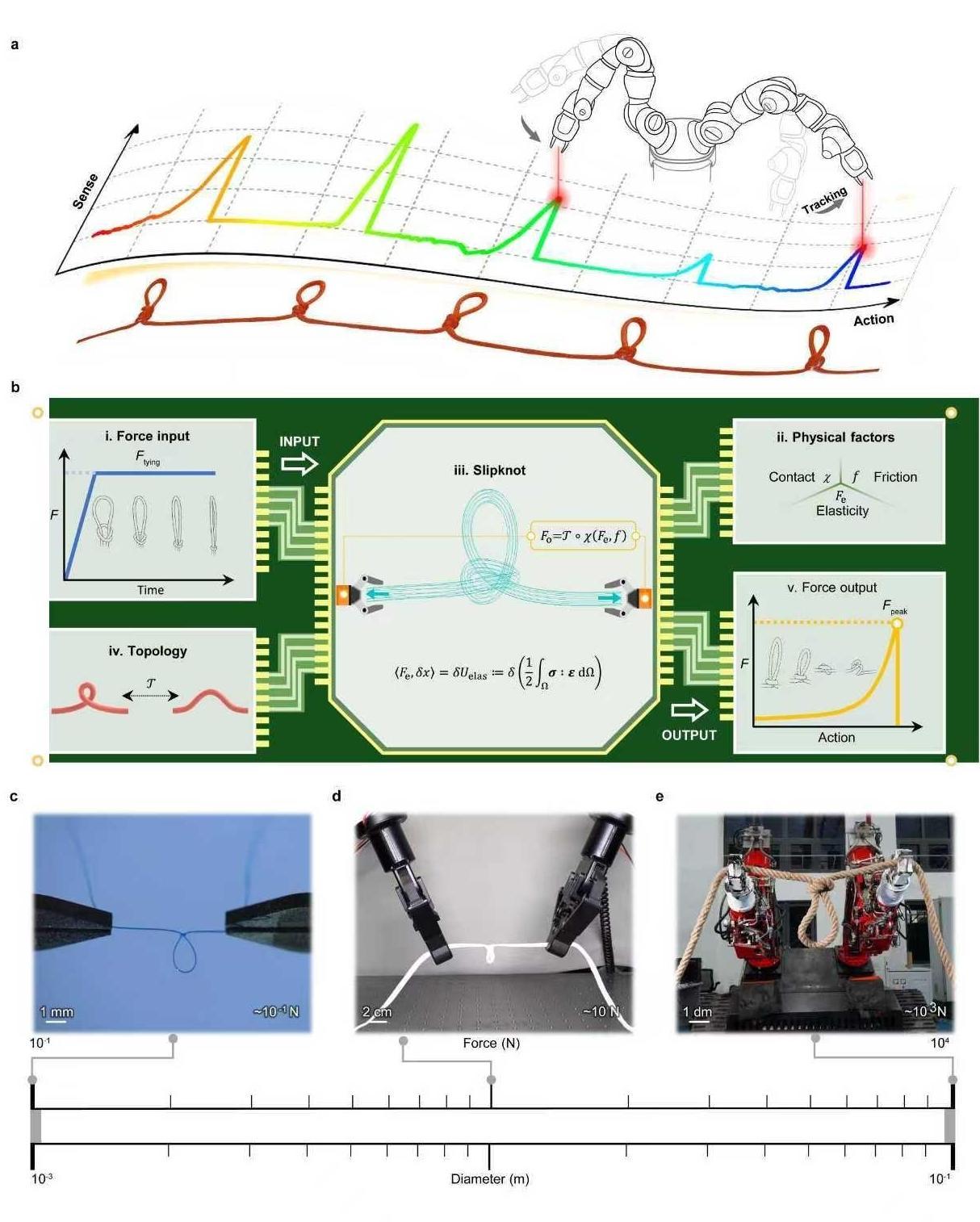 外科手術(shù)中傷口縫合的打結(jié)是項精細(xì)活。結(jié)打松了,難以有效止血;結(jié)打緊了,容易斷線或損壞器官組織。中國科學(xué)院院士、浙江大學(xué)航空航天學(xué)院交叉力學(xué)中心主任楊衛(wèi)團隊和中國科學(xué)院院士、浙江大學(xué)醫(yī)學(xué)院附屬邵逸夫醫(yī)院院長蔡秀軍團隊,歷時三年開展交叉研究,闡明了“基于活結(jié)的力學(xué)傳導(dǎo)機制”,并創(chuàng)新性研發(fā)出“Sliputure(活結(jié)智能縫線)”,成功將其應(yīng)用于外科縫合,解決了機器人手術(shù)“力盲”缺陷。此項研究于北京時間11月27日以封面文章的形式登上國際學(xué)術(shù)期刊《自然》。