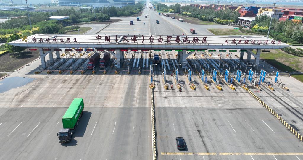 這是6月20日拍攝的天津自貿(mào)區(qū)天津港東疆片區(qū)入口處的中國(guó)(天津)自由貿(mào)易試驗(yàn)區(qū)海關(guān)特殊監(jiān)管區(qū)入口(無(wú)人機(jī)照片)。新華社記者 孫凡越 攝
