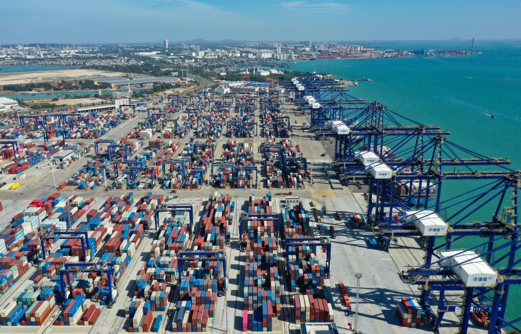 這是11月28日拍攝的洋浦港,是海南自貿(mào)港10個(gè)“二線口岸”之一(無(wú)人機(jī)照片)。新華社記者 郭程 攝